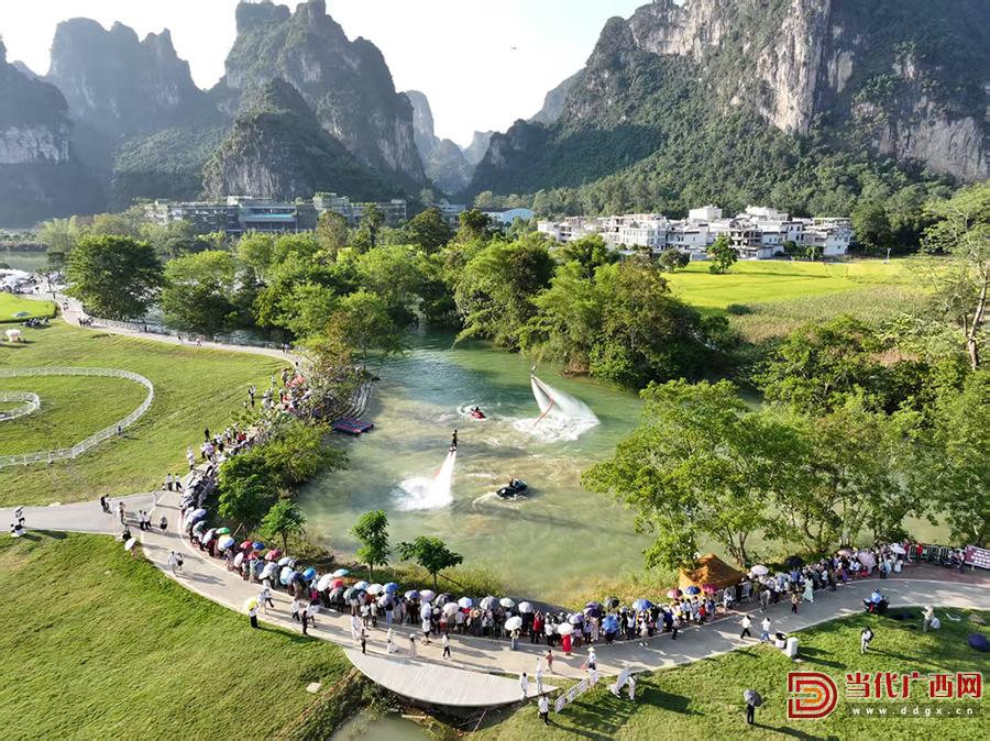 第七届大新明仕田园丰收季的水上飞人表演吸引游客驻足观看。明仕田园景区供图