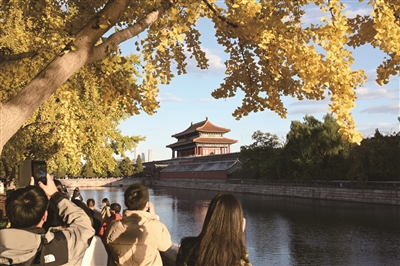 | 故宫神武门外护城河边,金黄的银杏搭配神武门城楼,成为市民不可错过的秋日美景 |