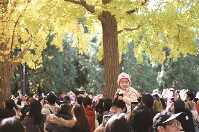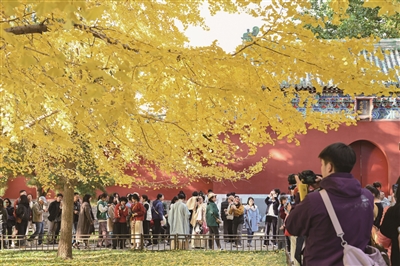 | 地坛公园的银杏大道上人流如织,游客们共同感受这场金色盛宴 |