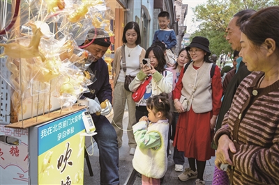 | 小朋友们体验吹糖人这项穿越千年的“甜蜜非遗”,这也是地道的“京华味道” |