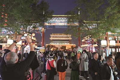 金秋时节,夜色降临,游客们在前门大街品尝美食、体验非遗、打卡灯光璀璨的正阳门城楼